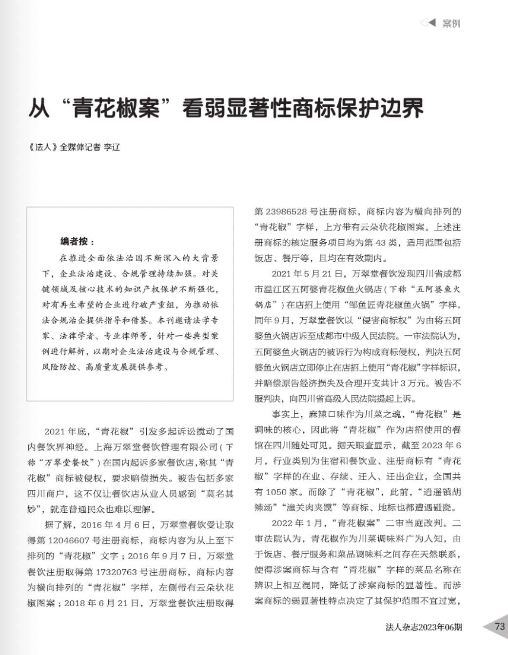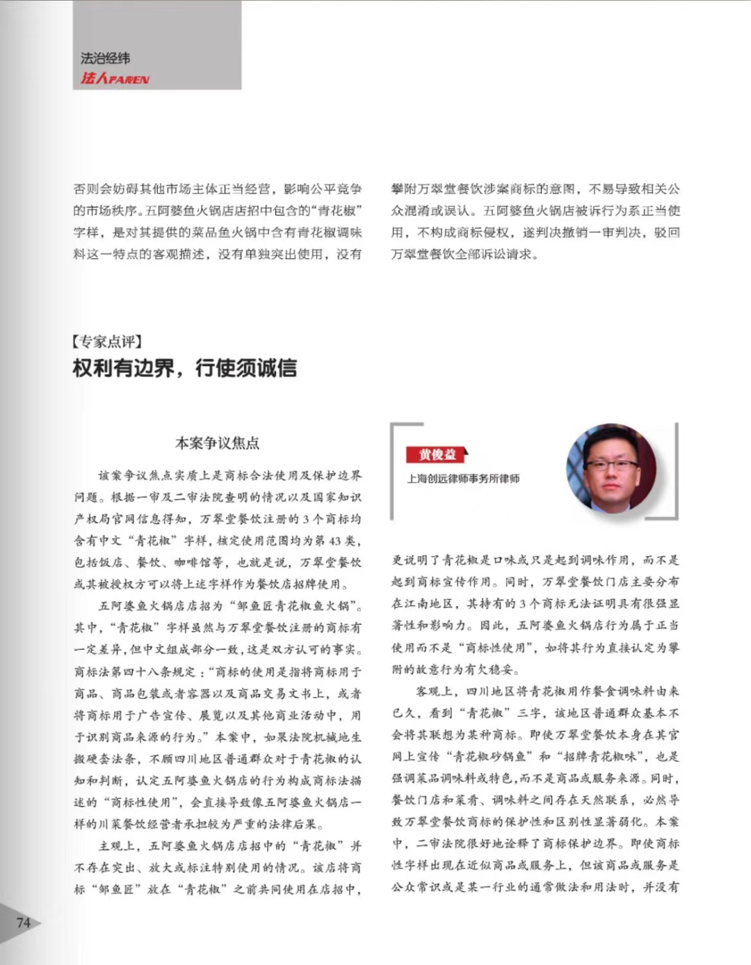 威海辉知简讯 | 辉知队黄俊益律师应“法治日报”旗下杂志邀请,就“青花椒”案发表专家点评